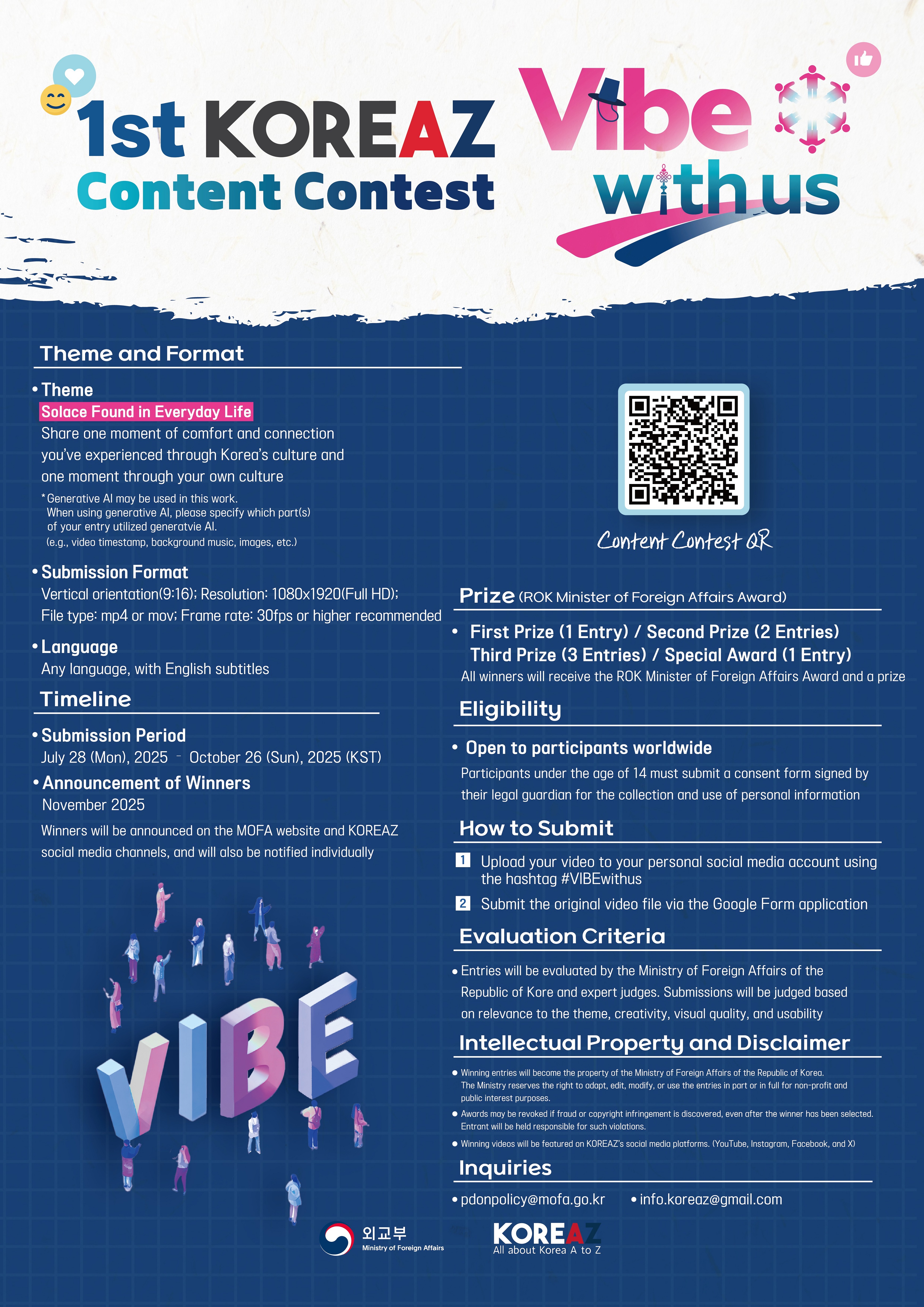 The Ministry of Foreign Affairs of the Republic of Korea is hosting the 1st KOREAZ Content Contest as part of the Digital Global Campaign.