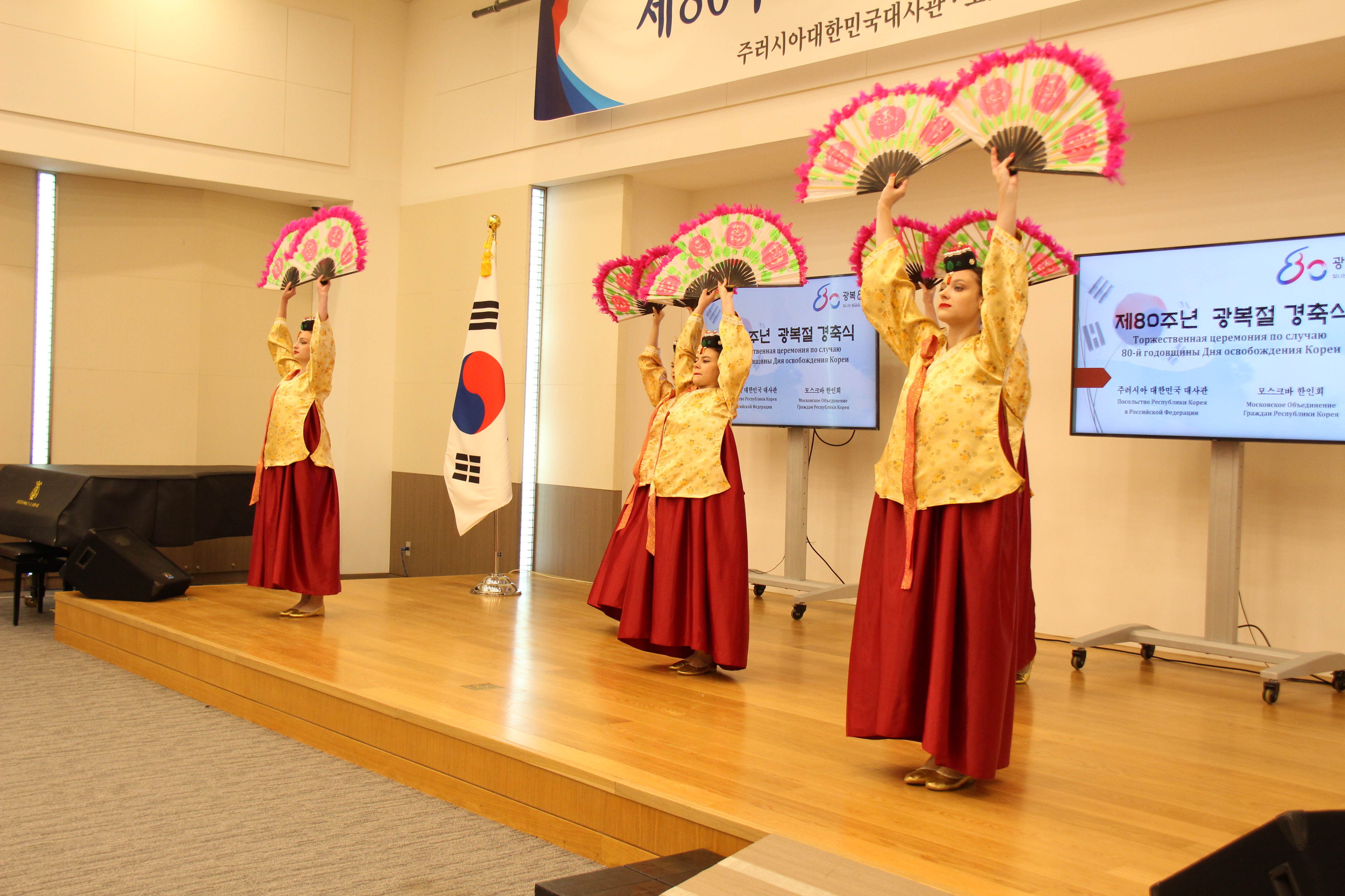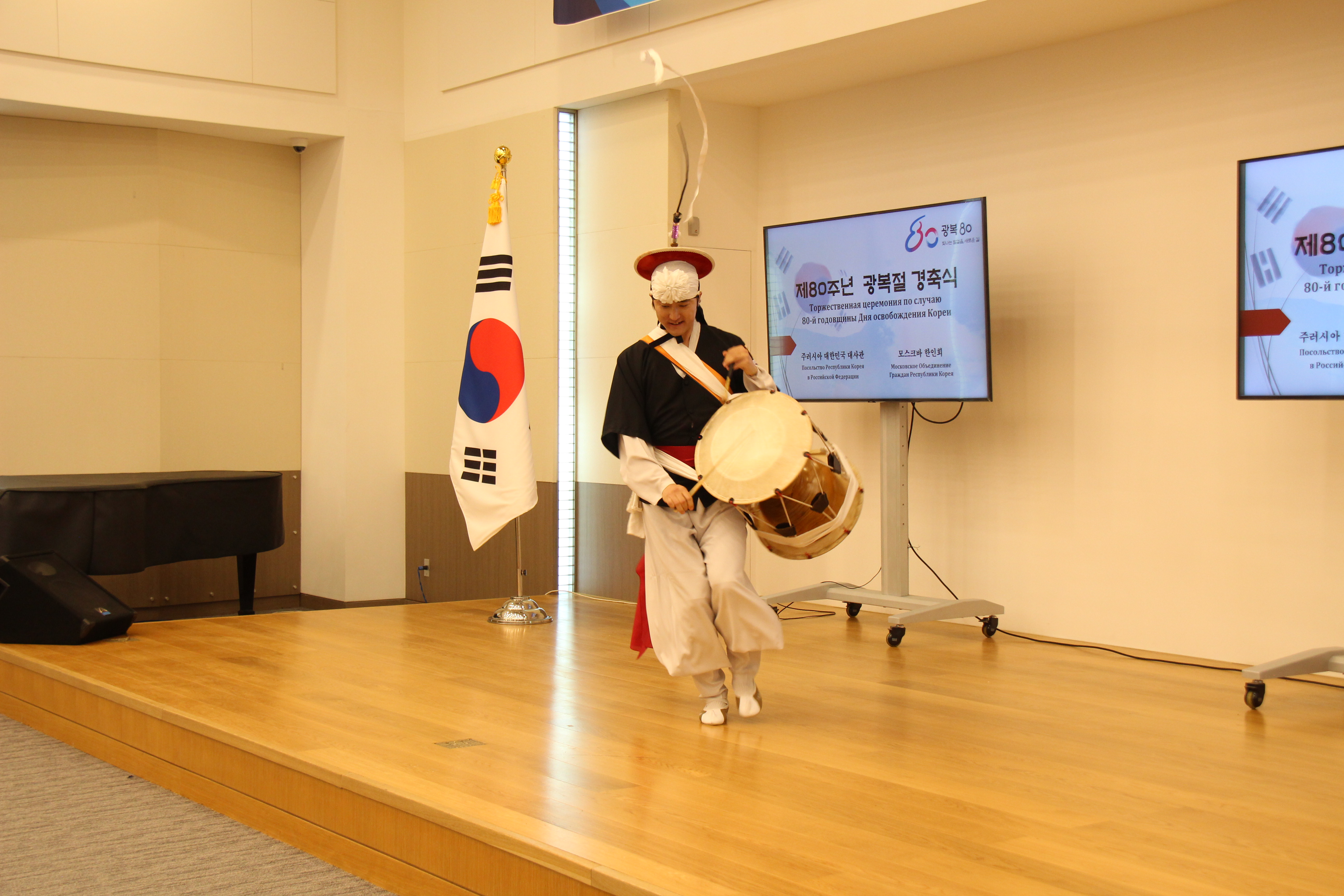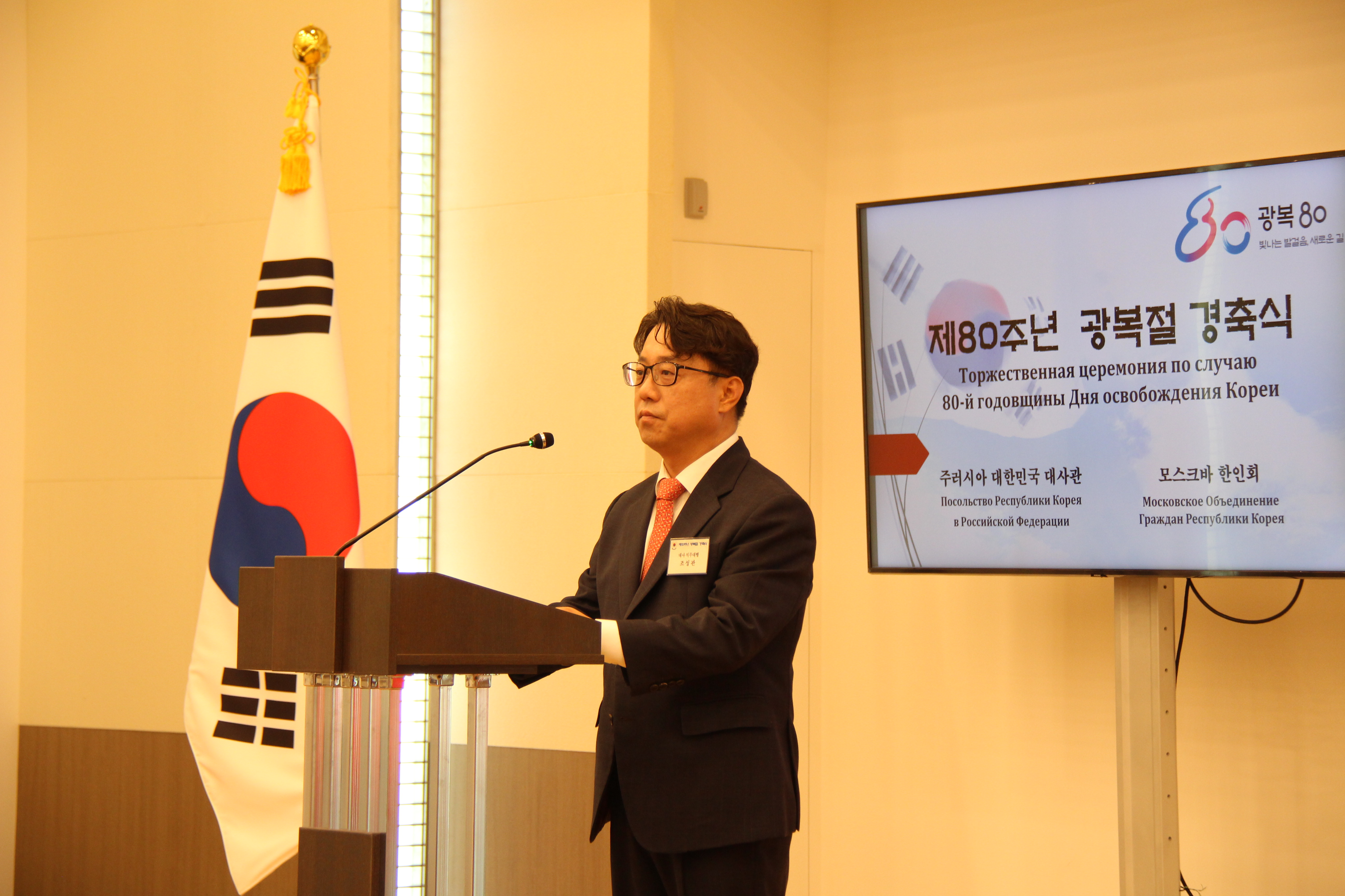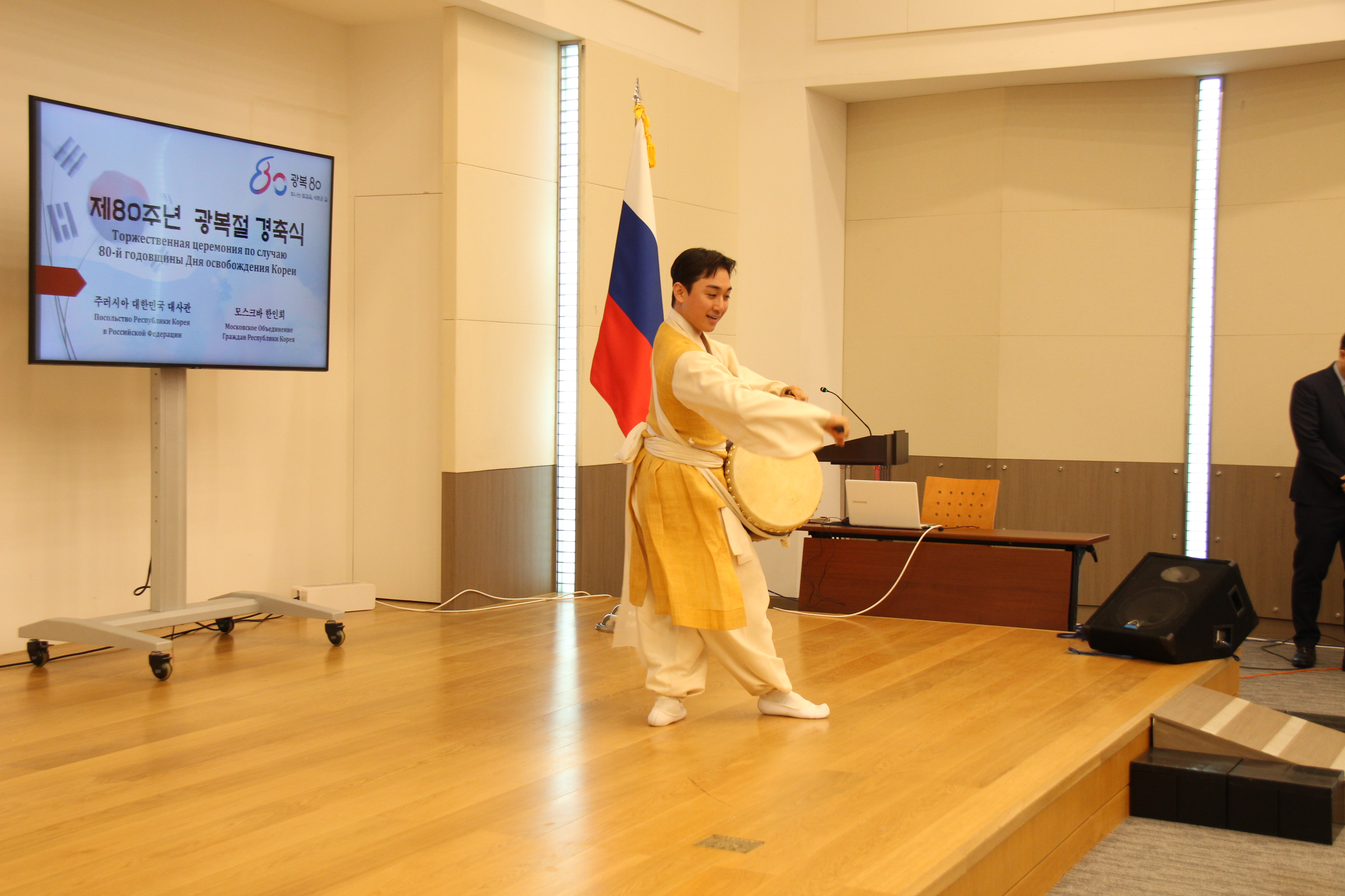 제80주년 광복절 경축식은 모스크바 한인회와 공동으로 개최하였으며, 재외국민ㆍ동포, 공공기관 대표 및 대사관 직원 등 140여명이 참석한 가운데, 국민의례, 애국가 제창, 순국선열 및 호국영령에 대한 묵념, 광복절 노래 제창, 만세 삼창, 대사 직무대행 인사말, 축하공연 등의 순으로 진행되었습니다.