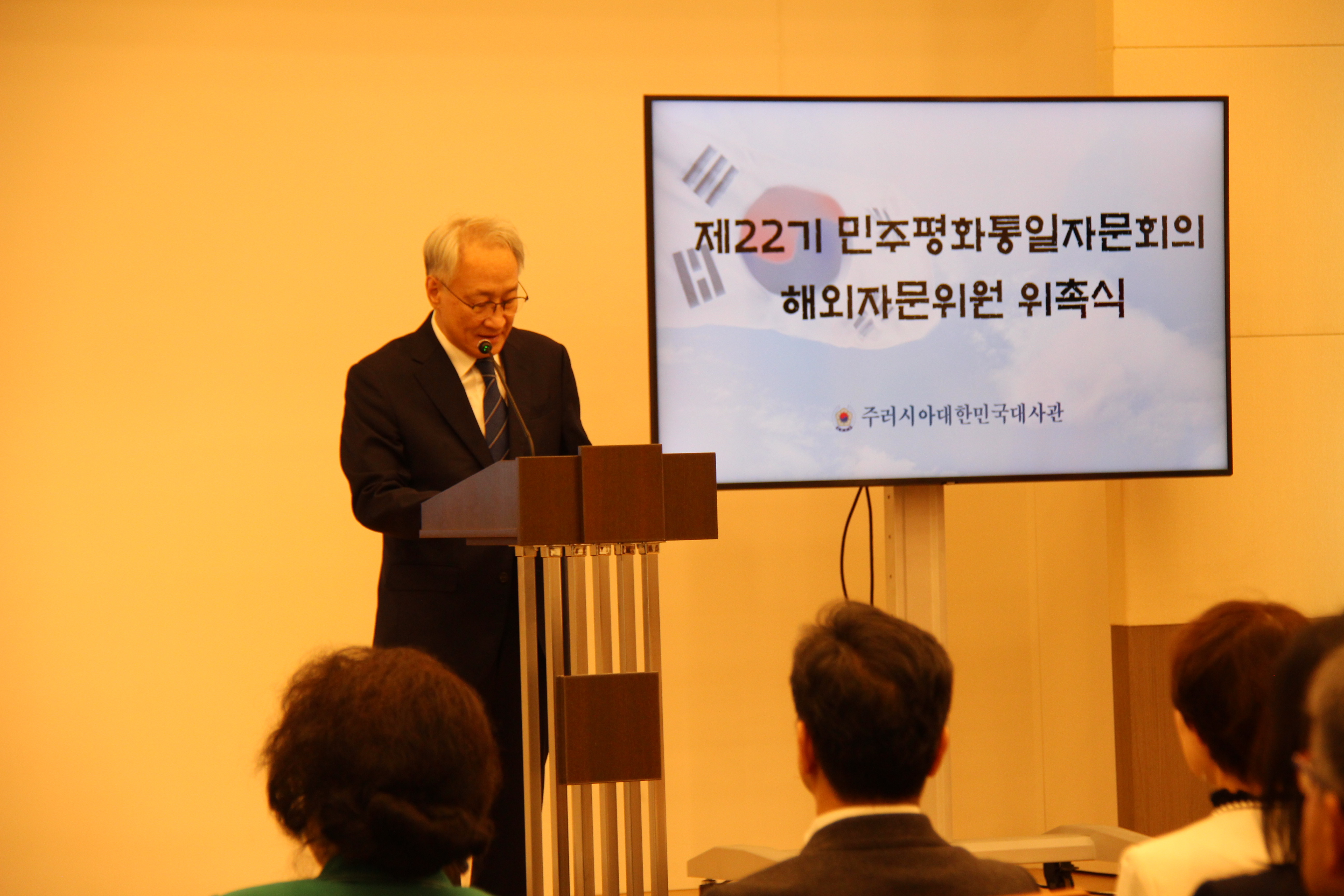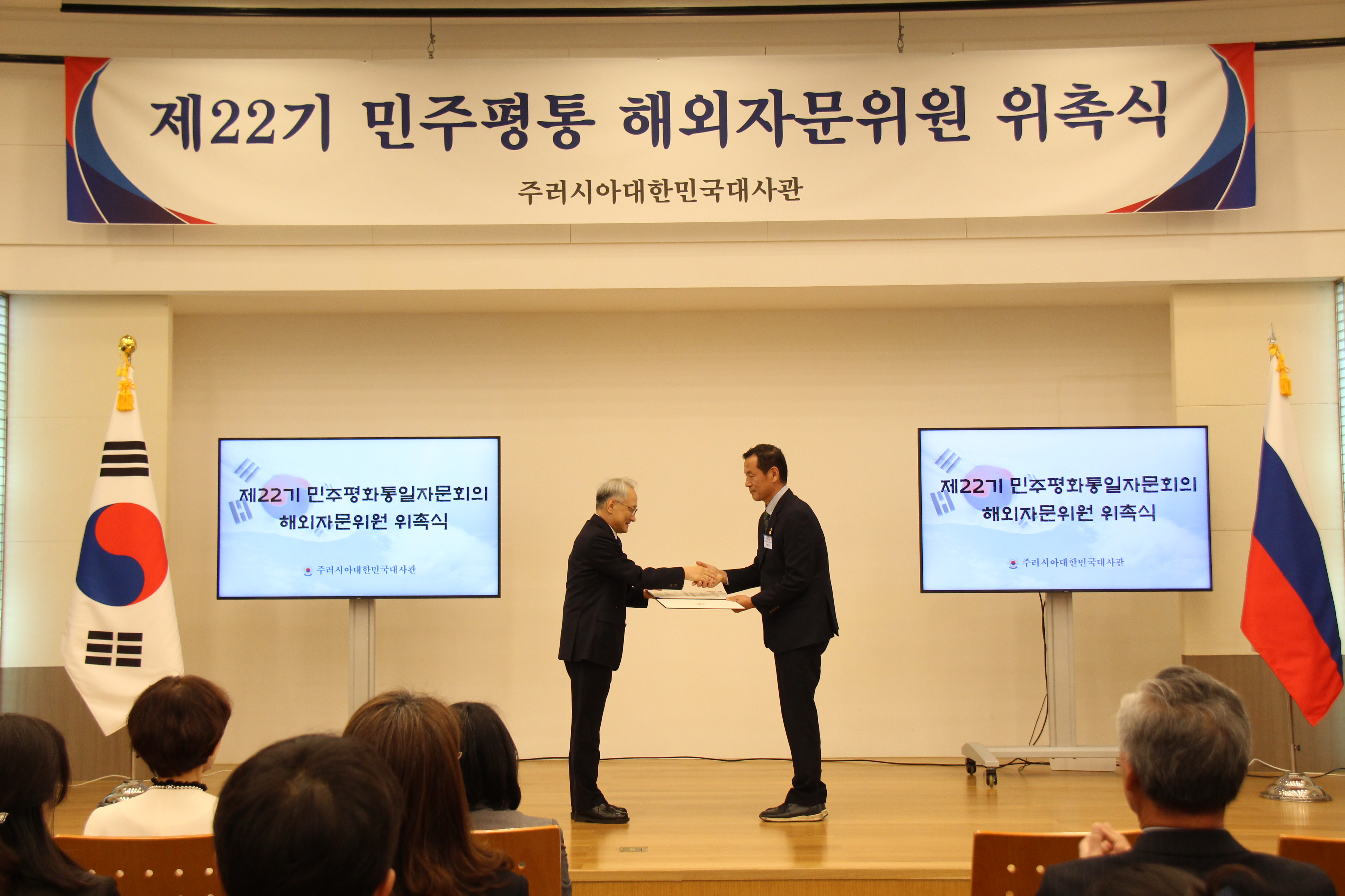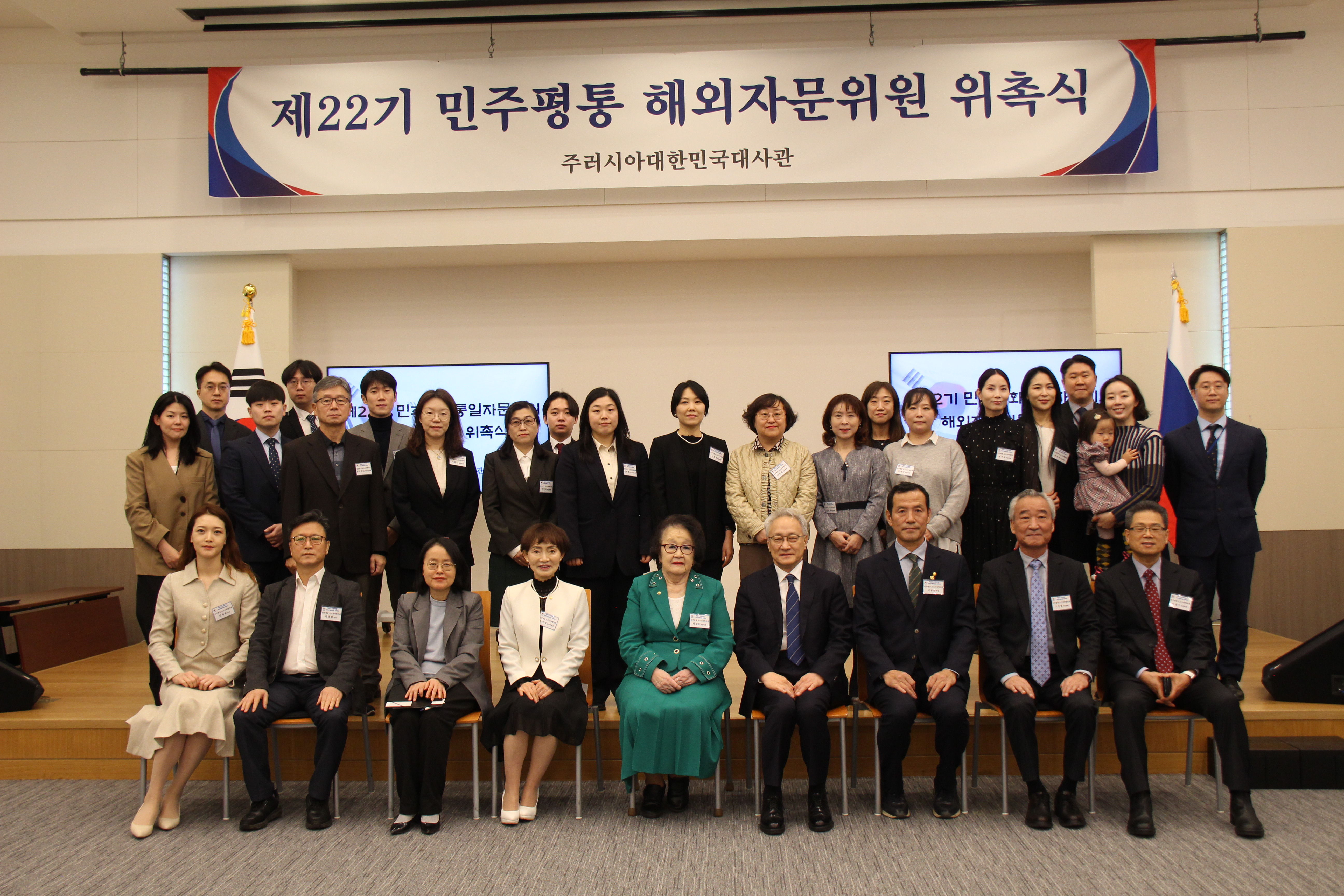 우리 대사관은 2025.12.12.(금) 청사 대강당에서 「제22기 민주평통 해외자문위원 위촉식」을 개최하였으며, 이날 이석배 대사는 민주평통 모스크바협의회(회장 : 이철수) 소속 자문위원들에게 위촉장을 전수하고, 자문위원들이 그간 현지에서 쌓아온 신뢰와 경험, 그리고 지혜가 대한민국의 평화통일 정책과 공공외교에 실질적으로 기여할 수 있도록 함께 노력해 나가자고 당부하였다.